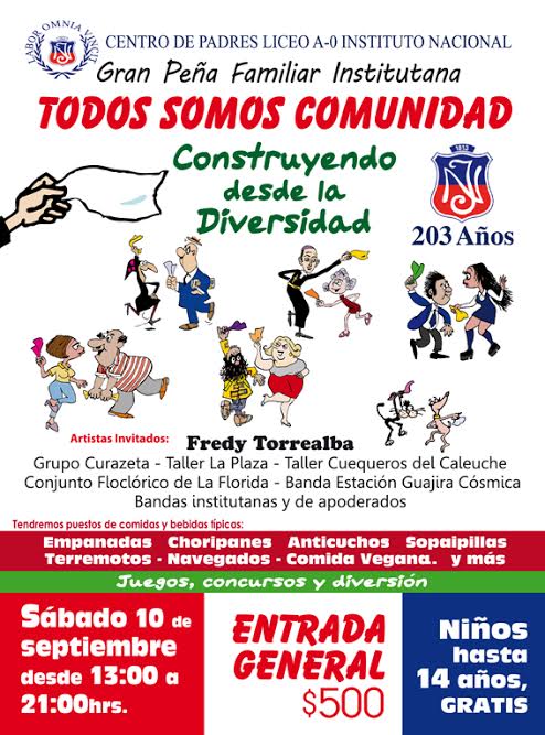 El Centro de Padres Liceo A - 0 Instituto Nacional, con el compromiso de estimular la integración de la comunidad educativa y el fortalecimiento de la Convivencia Escolar, invita a los estamentos a participar en la Gran Peña Institutana: "Todos Somos Comunidad, construyendo desde la diversidad" .